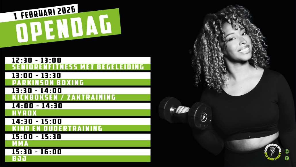 Een dag vol energie, workouts, demo’s en sfeer. Van seniorenfitness tot HYROX, van Parkinson Boxing tot MMA & BJJ. Je ziet, voelt en beleeft het allemaal.